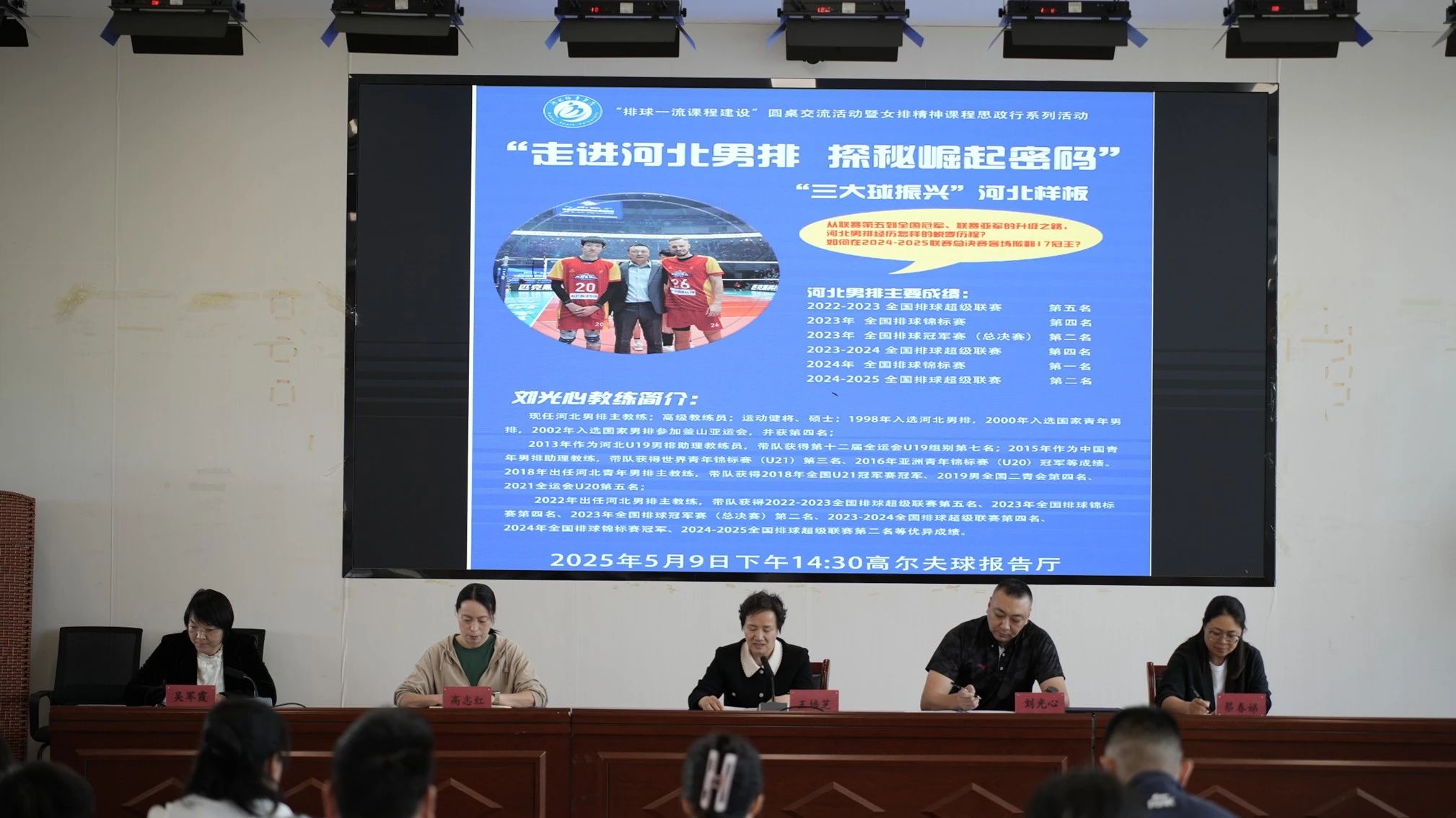 为进一步提升排球一流课程建设质量,打造特色课程思政资源与创新教学模式,排球一流课程与思政示范课建设依托学院排球课程思政与女排精神研究中心平台,特邀河北男排主教练刘光心指导来我院进行圆桌会议交流。